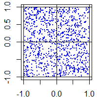−1≦x≦1, −1≦y≦1の範囲に,点(x ,y)をランダムに1000個描く x<-runif(1000, min=-1, max=1) #乱数1000個→x座標 y<-runif(1000, min=-1, max=1) #乱数1000個→y座標 plot(x,y,pch=16,col="blue",cex=0.3) #●青で小さい円 abline(h=c(-1,0,1)) #y=−1,0,1の横線 abline(v=c(-1,0,1)) #x=−1,0,1の縦線