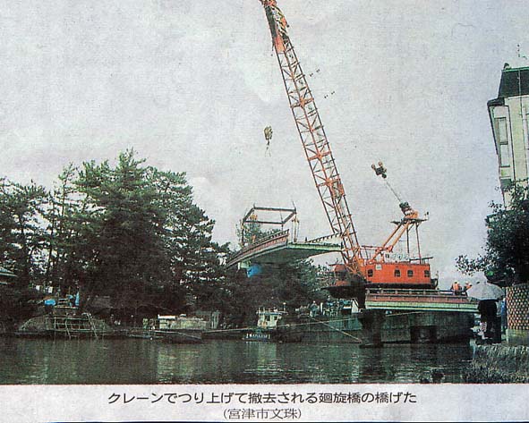 新聞やテレビでも紹介された「日本三景天橋立」の入り口に架かっている「廻旋橋(かいせんきょう)」が、 42年ぶりに架け替えられる事になりました。この「廻旋橋」は日本で唯一つ水平に廻旋する橋として 有名です。