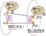 @:xが「限りなくaに近づく」ときにA:f(x)が「限りなくf(a)に近づく」ならば f(x)はx=aにおいて連続という.」 この連続の定義について,εδ論法では, Aのεとして「どんなに小さな(=0に近い)値を指定されても」,@の「δをうまく決めることができれば」「δを適当に選ぶことができれば」「δが存在すれば」連続であると定義する. |
