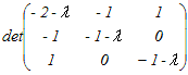 =00 の多い3行目に沿って展開 (−1−λ) =0(−1−λ)(3−λ)(−1−λ)=0 (λ−3)(λ+1)2=0 λ=3, −1 正の固有値はλ=3 → 3 |