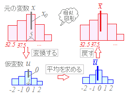 一般に,階級幅cの度数分布表において,仮平均をx0として仮変数uを導入するとき,元の変数xを用いた計算が複雑な小数計算であっても,uを用いた計算は,階級幅1の簡単な整数値の計算でできます.