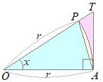 (A)右図において,2つの三角形と扇形の面積の比較から![]() ![]() ![]() ![]() の順に証明しているのであるが, (1)の扇形の面積が 確かに,小中学校では円の面積は
