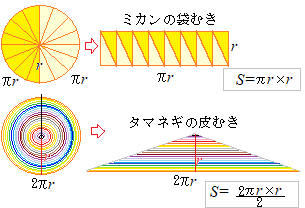 半径がこの他,小中学校では,無限と言う用語を使わずに,次の図のような「ミカンの袋むき」「タマネギの皮むき」で説明する場合もある.このようにして,三角関数の微分を使わなくても円の面積を求める方法はあるから,循環論法とは言えない. ![]() |