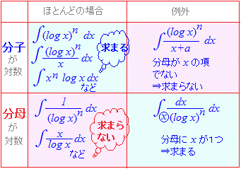 初等関数の微分は初等関数になりますが,初等関数の不定積分は必ずしも初等関数の範囲内にあるとは限りません.定期試験や入学試験などでは「解ける」問題だけが出題されていますが,各自で自由に思い浮かべた関数に対していつでもその不定積分を初等的に表現できるとは限らないことに注意してください. log x=tとおいて置換積分を行うと = → dx=x dtだから dx=x dx =+C =+C