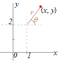 (3) 直交座標での点(1, 2)を極とし,x軸の正の向きを始線とする極座標を導入するとおく. (