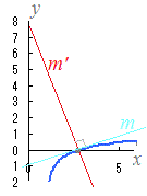 だから m==== m’=−tet t=1のとき x=e, y=0, m’=−e となって,法線の方程式は y=−e(x−e) y=−ex+e2 ※(参考) 次の図の水色が接線,赤が法線になります. ![]() → 2