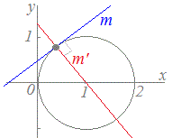 ※(参考)媒介変数を消去して元のグラフをx, yの関係式で表すと, x2+y2==2x すなわち, (x−1)2+y2=1 これは,点(1, 0)を中心とする半径1の円になり,法線は中心を通ります.次の図の青色が接線,赤が法線になります. ![]() |
