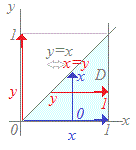 ≪解説≫右図の領域Dにおいて, (1) 青の縦線で示した線に沿って,はじめにxを固定して,それぞれのxに対して,0≦y≦xの区間で変数yで積分してxを含んだ関数として得られる式が 2xydy (2) 次に,0≦x≦1の区間で変数xで積分するというのが元の式 (2xydy)dx が表しているもの.