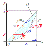≪解説≫右図の領域Dにおいて, (1) 赤の横線に沿って,はじめにyを固定して,それぞれのyに対して,y≦x≦の区間で変数xで積分してyを含んだ関数として得られる式が f(x,y)dx (2) 次に,0≦y≦1の区間で変数yで積分するというのが元の式 dyf(x,y)dx が表しているもの. 積分の順序を変更して, (1) はじめにxを固定して,それぞれのxに対して,yで積分するときは,青の縦線に沿って,x2≦y≦xの区間で変数yで積分して得られる式が f(x,y)dy (2) これらを0≦x≦1の区間で変数xで積分すると dx f(x,y)dy