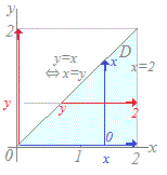 ≪解説≫右図の領域Dにおいて, (1) 青の縦線で示した線に沿って,はじめにxを固定して,それぞれのxに対して,x≦y≦2xの区間で変数yで積分してxを含んだ関数として得られる式が 2x2ydy (2) 次に,0≦x≦1の区間で変数xで積分するというのが元の式 dx2x2ydy が表しているもの. 積分の順序を変更して,はじめにyを固定して,それぞれのyに対して,xで積分するときは,図のように積分区間の右端がyの値によって変わるので,2つの領域に分けて求める. (1) 0≦y≦1の区間では,赤の線で示した線に沿って,≦x≦yの区間で変数xで積分して得られる式は 2x2ydx 1≦y≦2の区間では,赤の線で示した線に沿って,≦x≦1の区間で変数xで積分して得られる式は 2x2ydx (2) これらを0≦y≦2の区間で変数yで積分すると 2x2ydxdy+2x2ydxdyになる ※(参考)どちらで計算しても,結果はになる