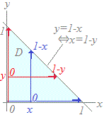 右図の領域Dにおいて,はじめにxを固定して,それぞれのxに対して,0≦y≦1−xの区間で変数yで積分してから xを含んだ関数として得られる式 (x2+y2)dy を0≦x≦1の区間で変数xで積分するというのが元の問題の表しているものとなっている. これは,はじめにyを固定して,それぞれのyに対して,0≦x≦1−yの区間で変数xで積分してから yを含んだ関数として得られる式 (x2+y2)dx を0≦y≦1の区間で変数yで積分したもの dy(x2+y2)dx に等しい. → 2 ※(参考)どちらで計算しても,結果はになる |
