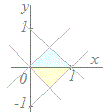 ※変数をx,yのままで積分を行うこともできるが,その場合は右図の水色,黄色の2つの領域(もしくは左右2つの領域)に分けて計算しなければならない.この問題では,上記のようにu=x+y, v=x−yと変数変換することにより,スマートに計算できるところがミソ. |