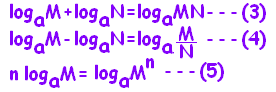 次の対数の定義を用いると(1)〜(5)が示せます。 ![]() a>0 のとき,a0=1 だから,これを対数の形に直すと 0=loga1 となります。 (2)← a>0 のとき a1=a だから ,これを対数の形に直すと 1=logaa となります。 (2')← または,logaa-1 → - logaa → -1 |
