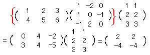 ![]() ![]() ※ 結合法則や分配法則の成立を一般的に示すには,行列の型に応じて,成分の数だけ両辺を比較する「息の長〜い計算」をします。(略) |