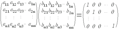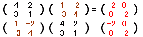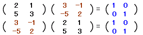 ○ n×n行列については逆行列の有無を考えることができます.正方行列でなければ逆行列を考える余地はありません.○ 一般にn×n行列 A に,右から掛けても左から掛けてもn次の単位行列となるn×n行列 B を A の逆行列といい,A- 1 で表わす.( AB=En ならば BA=En が成り立つので,右のように AB=En が成り立てばB は A の逆行列といえる.) |
