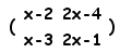 【例3.1】のとき, wxMaximaで,代数→手入力による行列の生成→行数2,列数2,タイプ:一般,変数名:Cなどとする →成分を x−3 2 2 x と埋める. 逆行列を求める関数はinvert()なので,invert(C)と記入して,Shift+Enter すなわち となって,逆行列が示される. ただし,逆行列が存在するためには,行列式Δ≠0 ⇔ x≠−1, 4が条件になる. |