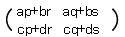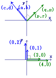 [解説] A= AB= だから,AB=0となるためには, cp+dr=0・・(3),cq+ds=0・・(4) (2)はベクトル(a,b)とベクトル(q,s)が垂直であればよい。 したがって,まず(a,b)に対する関係から(p,r)と(q,s)は平行です。 次に, (1)はベクトル(a,b)とベクトル(p,r)が垂直であればよく, (3)はベクトル(c,d)とベクトル(p,r)が垂直であればよい。 したがって,(p,r)に対する関係から(a,b)と(c,d)は平行です。 (a,b),(c,d)の傾きをkとすると,これらは(a,ka),(c,kc)とおくことができ,これに垂直な(p,r),(q,s)の傾きは-1/kですが,右下図のようにx軸に垂直なものもありえますので,(p,r),(q,s)を(−kr,r),(−ks,s)とおけば,