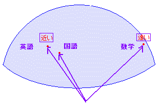 図 ![]() ※ 表11から生徒間で得点状況の類似性を調査するには,行ベクトル(B2〜D2など)の相関(cosθの値)を調べることになるので, Excel2002では,ツール→分析ツール(Excel2007では,データ→データ分析) →相関→OK →入力範囲: A2:D10 →データ方向:(このデータで生徒間の得点の類似性を見るには)行方向 →先頭行をラベルとして使用 →OK これにより,上の表9のような相関係数が得られる. |
