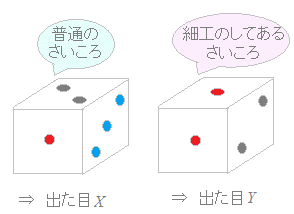 ■記号と用語 右図1のような「普通のさいころ」1個と,6の目を1の目に書き換えてTの目が2つあるように「細工をしたさいころ」1個の合計2個のさいころを投げて,出た目の数を各々X, Yとします.このとき,X, Yの出方に応じて確率を考えるには,右の表1のようにX, Yの確率分布を同時に考えます. このように,2つの確率変数の分布を同時に考えたものを同時確率分布(または同時分布,結合確率分布)といいます. (細工がしてある方のさいころは,1の目が2倍出て,6の目が出ないので,Yの分布は通常のさいころとは異なっています.)