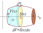 (体積の計算)立体の体積を求めるには,体積の微分が断面積になることを利用します. すなわち,左端aから座標xまでの区間にある体積をxの関数としてV(x)で表し,xにおける断面積をS(x)とおきます. 上で復習した面積の求め方と同様にして 儼(x)≒S(x)凅 が示されます.