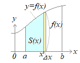 (面積の復習)a≦x≦bの区間でx軸とy=f(x)とで囲まれる図形の面積が,縦の長さf(x)の積分で表された事情を振り返ってみます. aからxまでに描かれる図形の面積をS(x)とおくと xがわずかに凅だけ増加したとき,増える面積は黄色で示した長方形の面積,すなわち縦の長さf(x)と横の長さ凅の積にほぼ等しくなります. 儡(x)≒f(x)凅 したがって 増分凅を限りなく0に近づけると,その極限は近似値ではなく正確f(x)に等しいと見なせます. 元のものが直接には分からなくても,その微分が分かれば,積分によって面積S(x)が求まります. a≦x≦bの区間では