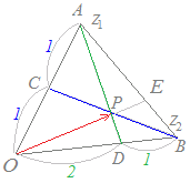 右図のようにDからBCに平行な直線を引き,OAとの交点をSとすると,△ODS∽△OBCとなるから,OS:SC=OD:DB=2:1 また,OC=CAだから OS:SC:CA=2:1:3 △ACP∽△ASDとなるから, AP:PD=AC:CS=3:1 よって,PはADを3:1に内分する. (1) A(z1 ), D(z2 )だから Pを表す複素数は,=…(答)