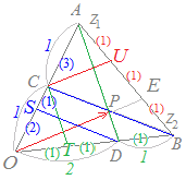 (2) CからOEに平行な直線を引き,ABとの交点をUとすると,△ACU∽△AOEとなるから,CからADに平行な直線を引き,OBとの交点をTとすると,△OTC∽△ODAとなるから, OT:TD=OC:CA=1:1 また,OD:DB=2:1だから TD:DB=1:1 △BPD∽△BCTとなるから, CP:PB=TD:DB=1:1 したがって,PはBCを1:1に内分する. Pを表す複素数は,=…(答) AU:UE=AC:CO=1:1 また,CP:PB=1:1だから UE:EB=1:1 よって,EはABを2:1に内分する. Eを表す複素数は …(答) 【解き方3】(チェバの定理を使って解く方法)