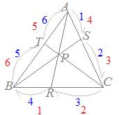 チェバの定理とは,右図のような△ABCにおいて,頂点からA,B,Cから点Pを通る直線を引いて,対辺との交点をR,S,Tとするとき,