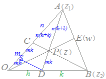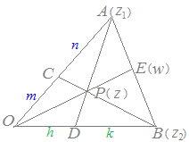 【問題2】右図の三角形において,頂点Aを表す複素数をz1,頂点Bを表す複素数をz2とし,OAをm:nに内分する点をC,OBをh:kに内分する点をDとする. (1)CBとADの交点Pを表す複素数zをz1 , z2を用いて表してください. (2)OPの延長が線分ABと交わる点をEとするとき,Eを表す複素数wをz1 , z2を用いて表してください. (2) |