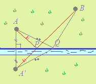 (1)中学校の図形の単元で学んだように,右図のような地形でA地点からB地点まで行くときに,途中の川で水をくんでから行く場合,図のPで示した地点で折れ線になるように行くと,歩いた距離が最短になります. この場所Pを求めるためには,川の端を表す直線を鏡のように考えて,点Aが鏡に写る像A'からBに直線を引きます.このようにA'から線を引くと,つねにAP=A'Pとなるので,AP+PBの代わりにA'P+PBの最短距離を求めたらよいことになり,それはA'Bが直線になるときに最短になります.