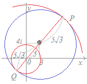 中心が3+4i,半径が原点からの距離|z|は上記の円に対して原点を中心とする円が内接する点Pにおいて最大値