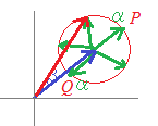 (三角不等式を用いた別解)|α|<|β|のとき,一般に次の不等式が成り立つ.(三角不等式と呼ばれる) |β|−|α|≦|α+β|≦|α|+|β| βを固定して,αの向きを変えていくと,α+βは図の赤で示した円周上にある. 1) αとβが同じ向きに平行なときに図のPで示した点で|α+β|の値は最大値|α|+|β|となる. 2) αとβが逆向きに平行なときに図のQで示した点で|α+β|の値は最小値|β|−|α|となる. ここで であるから,
