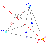 この公式をうまく使うには,次のように3点A, B, Pが一直線上に並ぶ特別な場合,すなわち内分点と外分点を考えるとよい.m|z−α|=n|z−β|(m≠n, n>0, n>0) を満たす点zの軌跡は,
