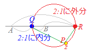 2点A, Bをn:mに外分する点を 直径の両端とする円になる. A, Bをm:nに内分する点をQ,m:nに外分する点をRとする. 垂直関係の証明はベクトルの方が簡単なので だから ここで, したがって,PはQRを直径の両端とする円周上にある.