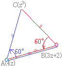 点A(4z)を中心としてB(3z+2)を±60°回転するとC(z3)に重なればよい(右図青の線)より A(8),B(8),C(8)が1つの点になり三角形ができないからz≠2とする.
