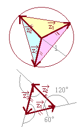 ベクトルで考えて,複素数z1, z2, z3をベクトルならば,各ベクトルのなす角が120°になることを示せばよい. 仮定により, 正三角形の内角は60°だから,その外角は120°になり,ベクトル 右の上の図において,黄色,水色,桃色で示した三角形はすべて2辺の長さが1でその間の角が120°であるから合同.よって頂点z1, z2, z3をつないでできる三角形は正三角形になる.