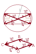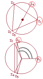 右図上のようにz1, z2, z3が正三角形になるように並べておくと,z1+z2+z3=0になる.これとは独立にz4, z5が直径になるように並べておくと,z4+z5=0になる. そうすると, (z1+z2+z3)+(z4+z5)=0 が成り立ち,正三角形と直径は独立に決められるから,五角形としては正五角形でも何でもないものになる. また,右図下のように1つの頂点z1=1を固定してから, 次に,z2, z3の実部の和が