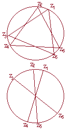 右図上のようにz1, z3, z5が正三角形になるように並べておくと,z1+z3+z5=0になる.これとは独立にz2, z4, z6が正三角形になるように並べておくと,z2+z4+z6=0になる. そうすると, (z1+z2+z3)+(z4+z5+z6)=0 が成り立ち,六角形としては正六角形でも何でもないものになる. また,右図下のように互いに直径となる3組の複素数z1, z4,z2, z5,z3, z6を作ると,それぞれz1+z4=0,z2+z5=0,z3+z6=0となるから (z1+z2)+(z3+z4)+(z5+z6)=0 を満たす.このとき六角形は正六角形でも何でもない.