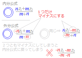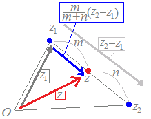 m, nを実数とするとき,異なる2点z1 , z2をm:nに分ける点を表す複素数は m,nが同符号の場合は内分点を表し,異符号の場合は外分点を表す. (ただし,m=−nの場合は考えない.) ![]() |