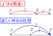 右図2のような間違いがよく見られますので注意してください.「ABを2:1に外分する点P ⇒ AP:BP=2:1」というとき,片足は必ずPになっていなければなりません.