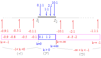 (参考) m:nをk:1で表したときのkの値と分点の場所 ![]() (イ) −1<k<0のときはz1の外側の外分点になる. (イ) −∞<k<−1のときはz2の外側の外分点になる. |