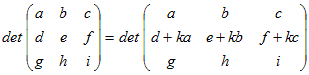 (1) k倍した行について余因子展開すると分かる.![]() ![]() ![]() (2)(3)この頁では証明略 (1)(2)(3)を組み合わせて、行列式を扱いやすい形に変形していくことができる. 例