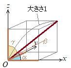 右図のように直線とx, y, z軸の正の向きがなす角を各々α, β, γとするとき,方向余弦はcosα, cosβ, cosγに等しい.(備考) (1) 方向ベクトルをその大きさで割ると単位ベクトルになるが,向きとしては,ある向きとその逆向きの2通りが考えられる.だから,単に「方向余弦を求めよ」と問われた場合には,複号で答えることになる. (2) 単位ベクトルの成分を並べたものを方向余弦と呼ぶことが多い.単位ベクトルの成分表示そのものではない.