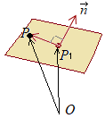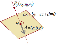 右図においてPHを含む平面がところで,2つのベクトルの内積は となるが,ここで であるから そこで,平面の法線ベクトル との内積をとれば, |