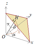 (2) 3次元空間において,原点から平面に下ろした垂線の長さをh,垂線とx軸の正の向きとのなす角をα,y軸の正の向きとのなす角をβ,z軸の正の向きとのなす角をγとすると,平面の方程式は