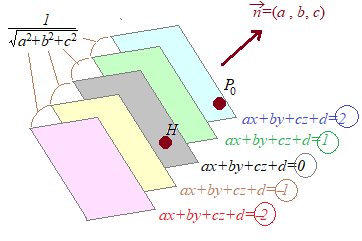 となって,点と平面の距離(符号は付いている)に等しくなる. より ここで 負の値になれば正に変えるものとして,絶対値を付けると,公式が得られる. |