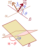 2つの平面のなす角は,それぞれの法線ベクトルのなす角に等しい(ただし,高校では0°〜90°で答える.)