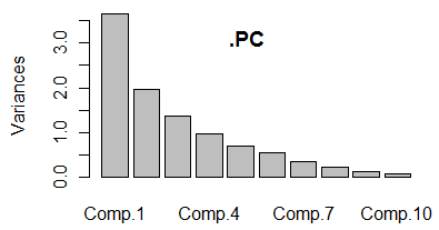 2. カイザー基準とは,元のデータを標準化したデータ(相関行列から分析したとき)を用いたときに利用できる基準.この場合には,全体の分散が「変数の個数」に等しくなり,各変数の分散が「固有値の大きさ」に等しくなることを利用する.主成分に情報を集約しているのだから元の変数1個分以上となる主成分を採用するというのがカイザー基準. 3. 各主成分(component)の分散(variance)を棒グラフにすると図3のようになる.(折れ線グラフで表すことが多い.)このとき次の図のようにエルボーができた所よりも先には情報が少ないので,エルボーまでの主成分を採用するという考え方.