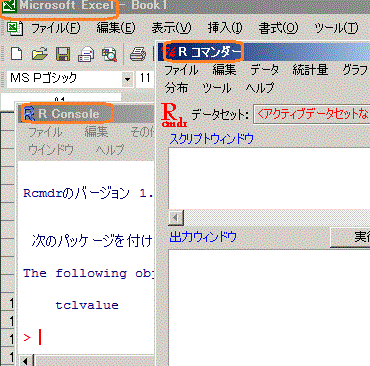 | ○RとRコマンダーの起動と終了 Rを単独に使うと,一昔前のMD-DOSにおいてキーボードからコマンドを打ち込む「パワーユーザー」のような使い方になるが、RExcelとRコマンダーもインストールしておくと多くのコマンドを画面上のマウス操作(GUIモード)で使える. これらはExcelのアドインとしてインストールされるので,実際に使うときは次のような流れになる.