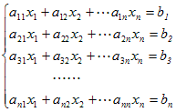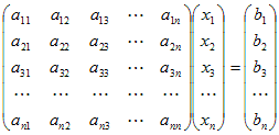 このように連立1次方程式を(*2)の形 A= で表すとき,行列1行1列成分が等しい → ax+by=p 2行1列成分が等しい → cx+dy=q となり,(*1)に一致するから. を係数行列という.このとき,未知数の組は列ベクトル(2×1行列) で表され,右辺の定数項の組は列ベクトル(2×1行列) で表される.○ - - - 未知数がn個のとき - - - 一般に未知数がn個 x1, x2, x3, ··· , xn の連立1次方程式 ![]() ![]() |